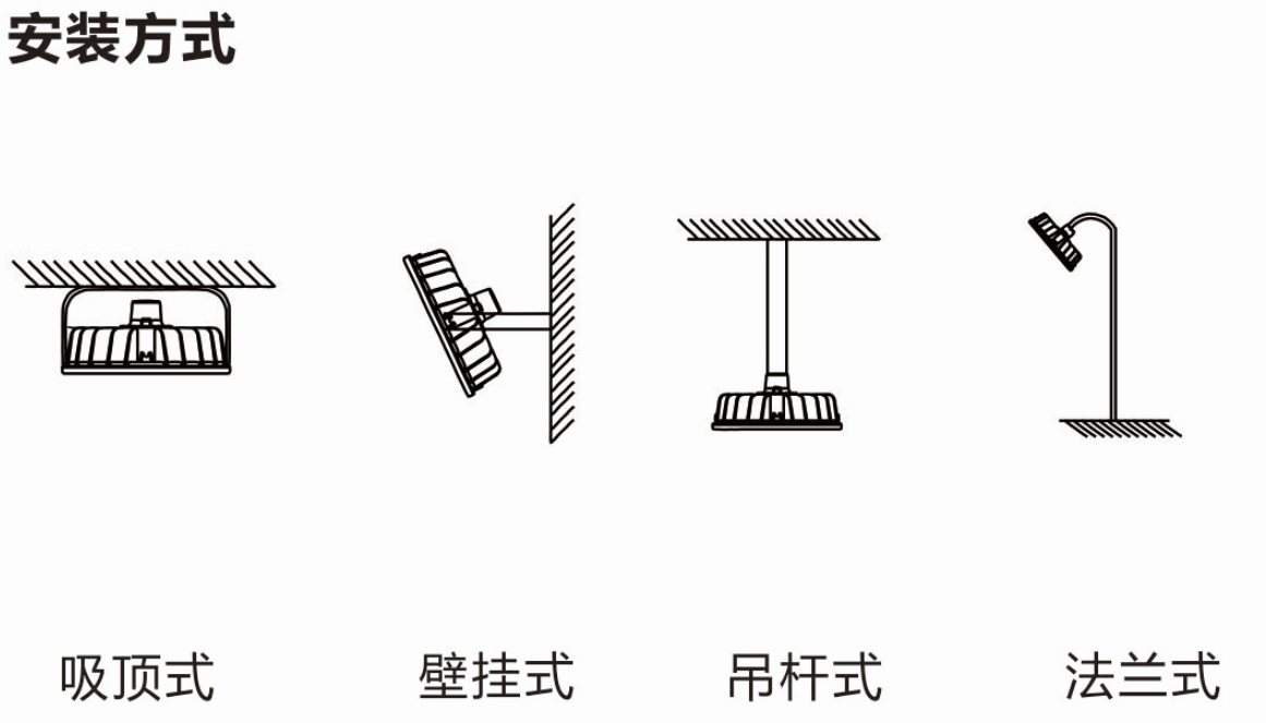 █安装方式:吸顶式、侧壁式、吊杆式等多种安装方式,可根据现场工作环境进行选择。