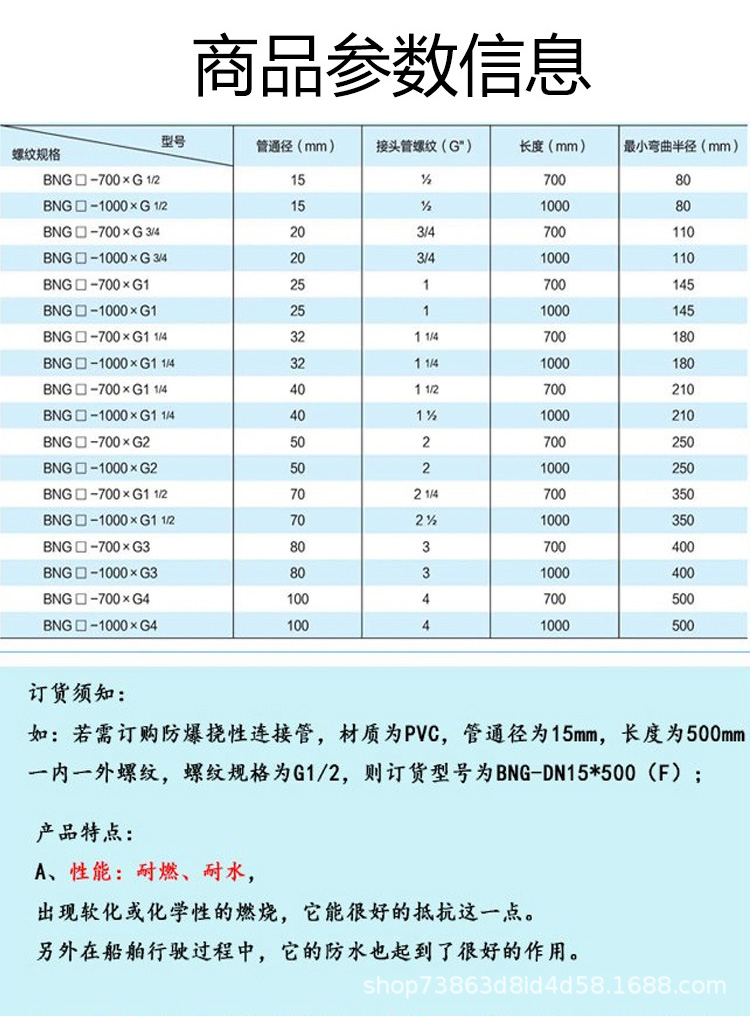 ■挠性管长度,螺纹尺寸可根据用户需要特殊加工。如NPT螺纹,公制螺纹等。
