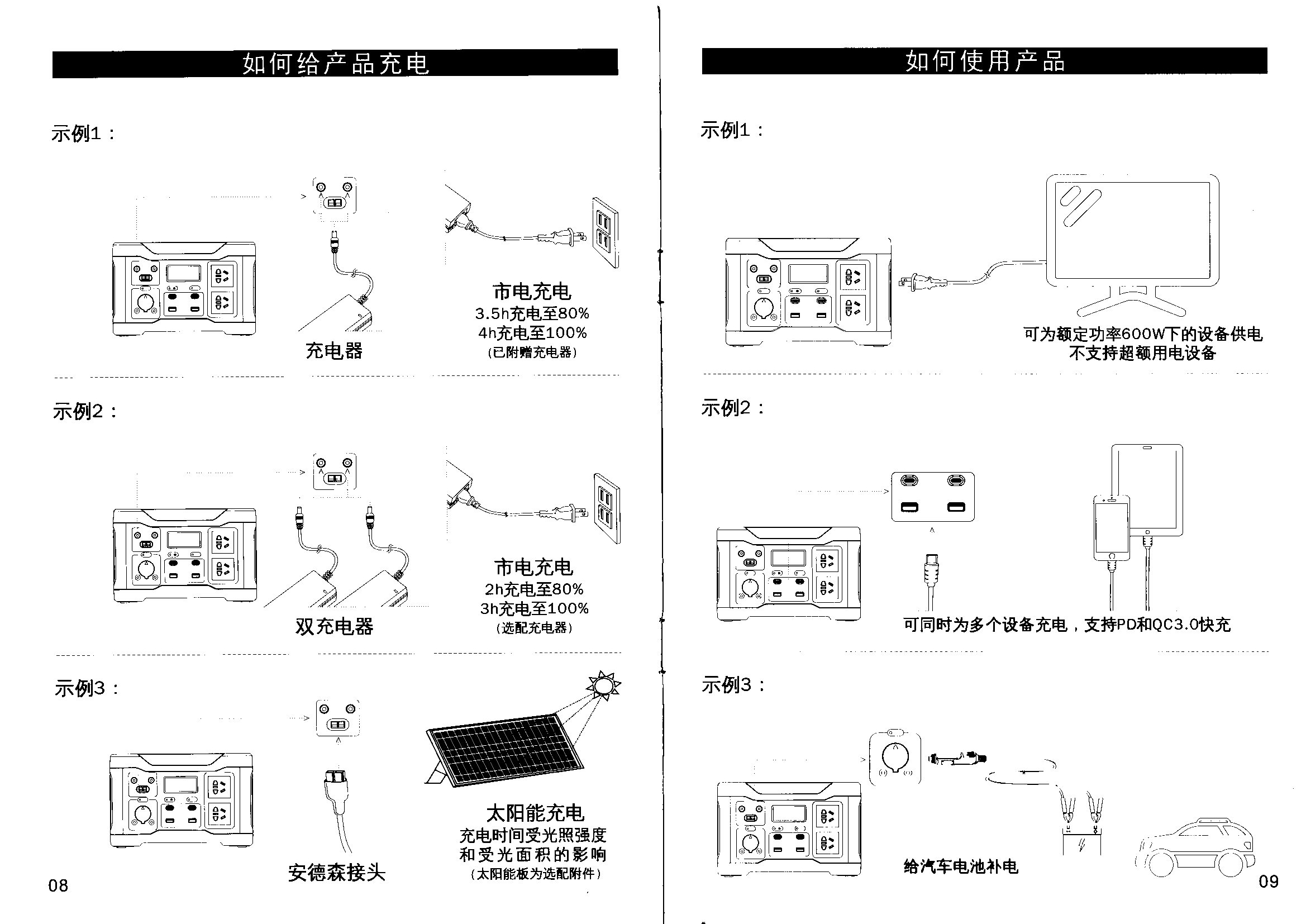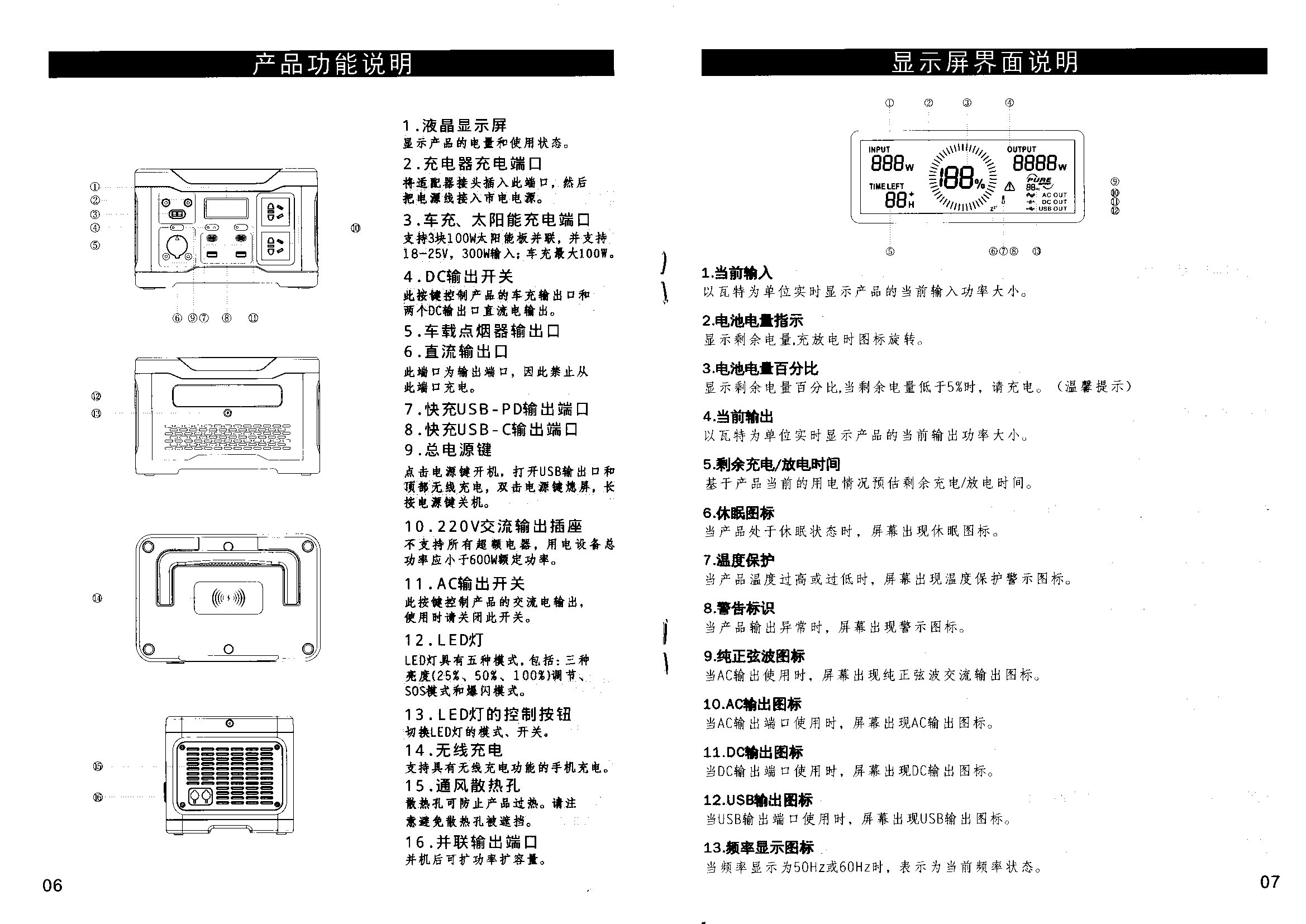 ■本机集成过载、过热、短路、过压、欠压等安全保护技术,排除故障后,关闭电源开关后重新打开即可复位电源重新工作,若重新开机无效,需接入充电器充电5S唤醒电池,本机即可正常工作。