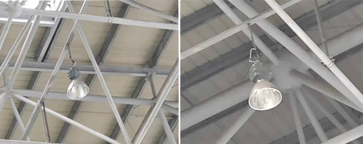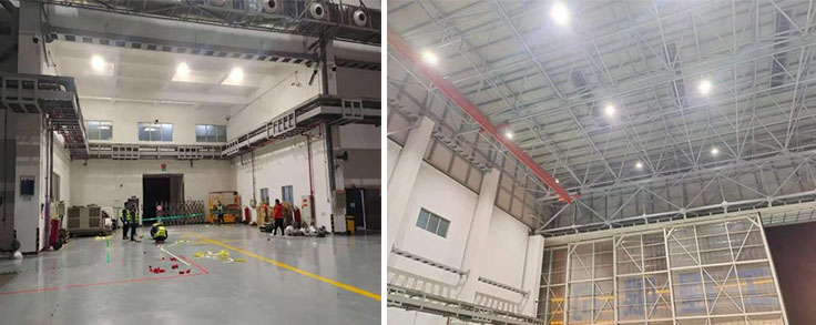 华夏航空维修机库改造前灯具使用1000W金卤高顶灯,电量损耗大、维修率很高、客户反馈经常需更换灯泡与和触发器。因经常需维护,故需购买一辆高空作业车。改造后使用的我司BFC8800ALED防爆高顶灯灯具,现场照明效果好,满足飞机维修与保养等精细作业,大大减少了电量损耗,满足了客户节能要求。