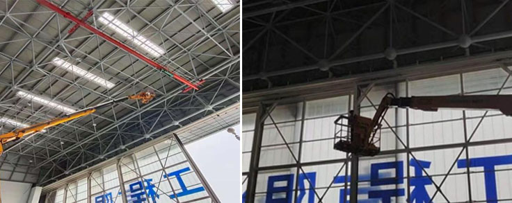 华夏航空维修机库库顶与地面的高度为20米,因机库在停机坪旁边,震动较大,温度在-20℃至+40℃,电压波动在180v到230v之间,使用频率在每天15小时左右,平时也有喷漆作业。